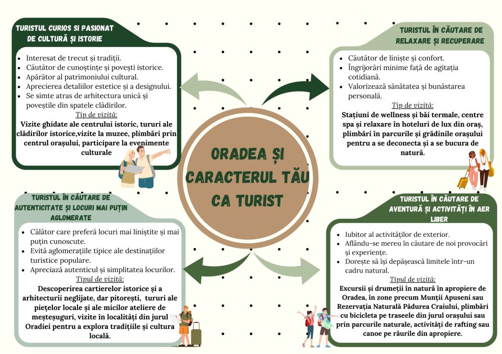 Aceste tipuri de turiști reflectă o varietate de motivații și preferințe, iar Oradea oferă activități și locuri care pot satisface o gamă largă de interese. Oricare ar fi caracterul tău ca turist, orașul te va cuceri prin farmecul său, oferind un echilibru între istorie, cultură, relaxare și explorare.